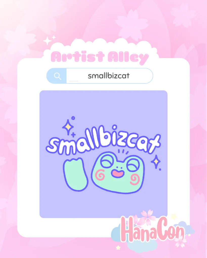 Hi, ich bin smallbizcat bzw Cat (keine Pronomen/Name) und seit 2021 mit meinem Stand voller Frösche auf Cons unterwegs. Kommt doch gerne vorbei und lasst euch von meinem OC Frosch namens Freddy und süßem Fanart überzeugen.